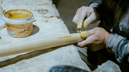 Close-up of skilled craftsman carving intricate details on wooden object in a rustic workshop