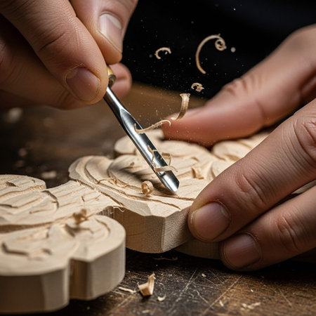 A close-up shot focuses on the skilled hands of a craftsman using a small chisel to meticulously carve an intricate pattern into a piece of wood. Wood shavings curl up from the tool, highlighting the precision and dedication involved in the traditional craft of woodcarving.