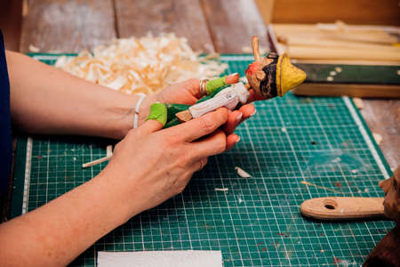 A wooden toy in women's hands. A female carpenter cuts wood with a knife in a carpentry or makeshift workshop. Dust and shavings fly in the air.Workplace.