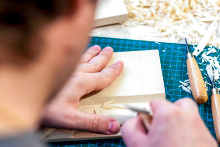 Woodcarver cuts out patterns on a wooden board with a sharp knife.