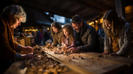 craftsman working with wood at a street market at his stall of handmade wooden items