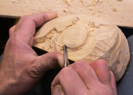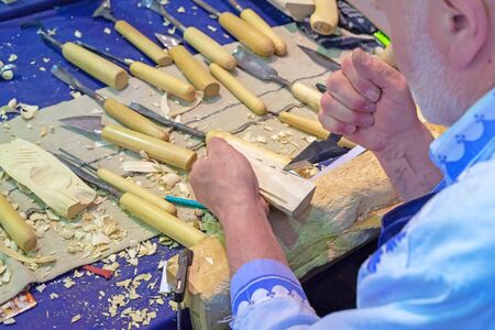 Carving. Handmade by the master. Tools for carving. Woodwork. Chip.