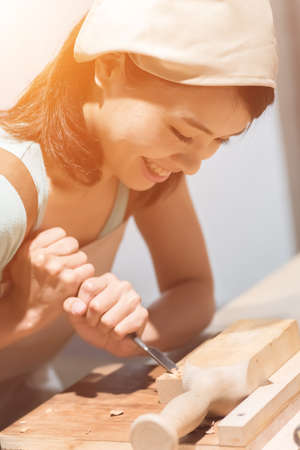 A female carpenter cuts wood with a knife in a carpentry or makeshift workshop. Dust and shavings scatter in the air.Workplace. Manufacture of wooden toys.