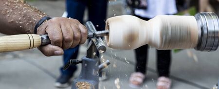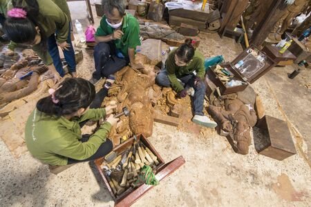 Chiang Mai, Thailand - July 1, 2017: craftsman use a gouge to carve traditional bas-relief on wood at Lanna Expo 2017 in Chiang Mai, Thailand on July 1, 2017.