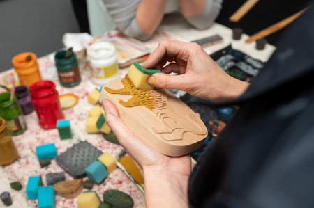 Hands crafting with wooden stamp and sponges in creative workshop.