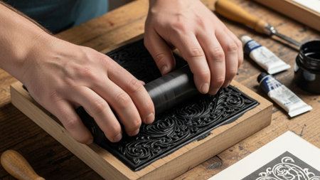 High-angle flat lay of an artisan carefully inking an intricate wood block for relief printing. Focus on craftsmanship and analog creative process.