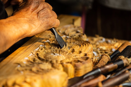 Skilled craftsman doing wood carving using traditional method