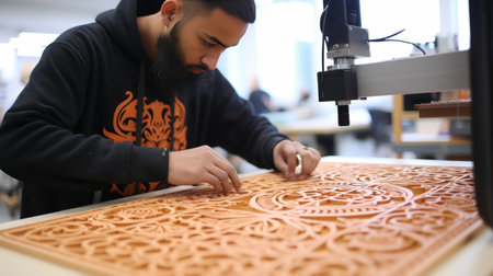 A skilled artisan operates a CNC machine to carve intricate designs into a wooden panel in a bright workshop. The process showcases precision and craftsmanship.