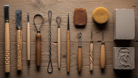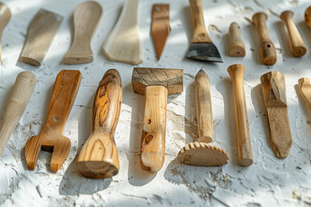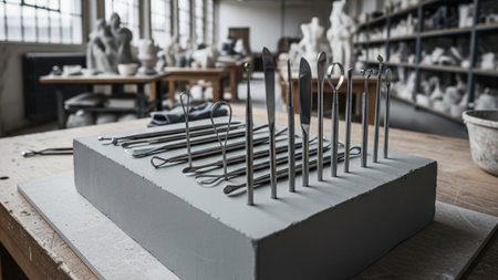A collection of sculpture tools neatly arranged on a workbench. --ar 3:2 Job ID: 02400053-8a3e-4ecd-bbb3-ffacb5b54180
