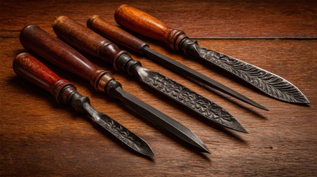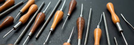 Close-up view of wooden handled awls on dark surface. That the image is generated using AI.