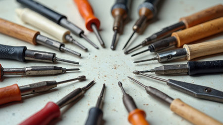 Variety of precision tooltips arranged in circular pattern on workbench. That the image is generated using AI.