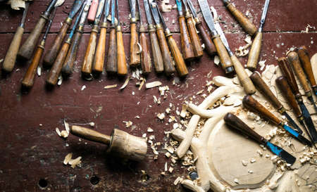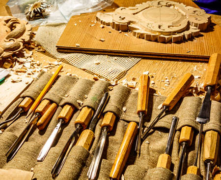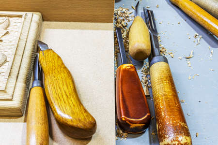 Wood carving, wood carving tools. craft, chisel, wooden background