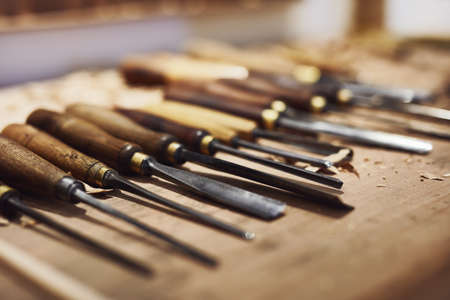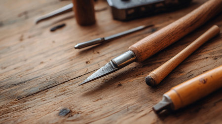 Close-up of wood carving tools with wooden handles on a weathered wooden workbench. Focus on the sharp blades and worn surfaces, suggesting craftsmanship and artistry.