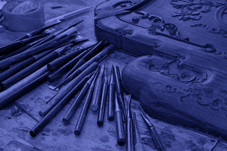 Wood carving tools arranged in an unorderly manner, carving wood in Thailand
