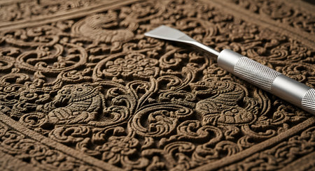 A close-up shot showcasing a piece of traditional, intricate carving in wood or stone, featuring ornate floral and animal motifs. A sharp chisel tool rests on the detailed surface, highlighting the process of a skilled artisan. This image represents craftsmanship, artistry, tradition, and meticulous handiwork.