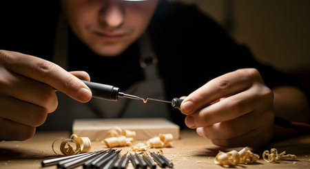 Close-up view of an artisan carefully carving a delicate leaf design into a brown material block using a specialized crafting tool. Delicate white shavings are scattered around the work surface, illustrating the meticulous creative process and intricate detail involved in the craft. Dramatic lighting highlights the textures and forms, emphasizing the precision and artistry of the handmade work.