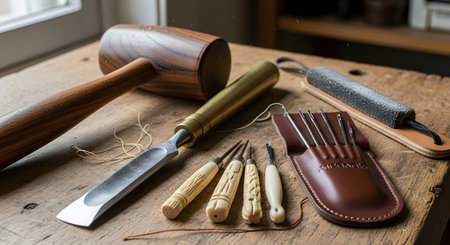 A selection of high-quality woodworking and carving tools are neatly arranged on a rustic wooden workbench. The collection includes a wooden mallet, a chisel, and a set of fine, ornate carving knives, symbolizing craftsmanship, hobbies, and traditional skills.