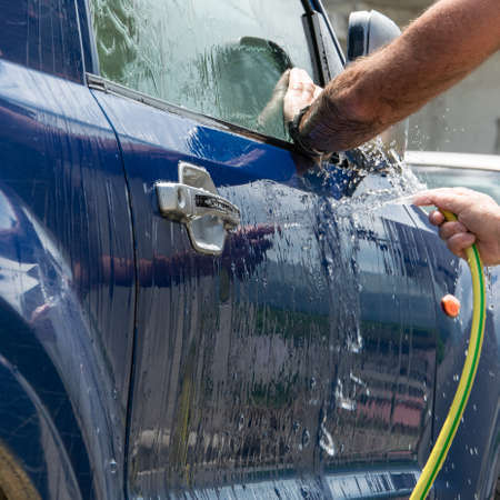 Self-service car wash, a man washes his car under the pressure of a jet of water, a blue car. 2020
