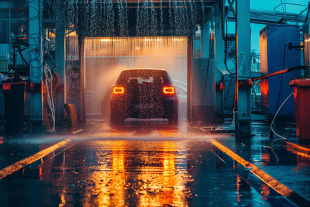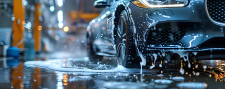 Vehicle in car wash covered with soap suds and water during an evening cleaning