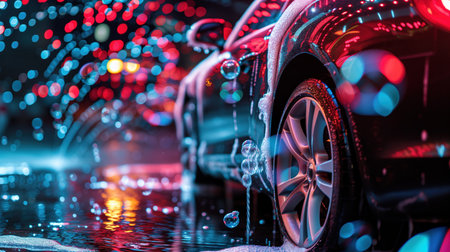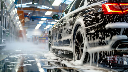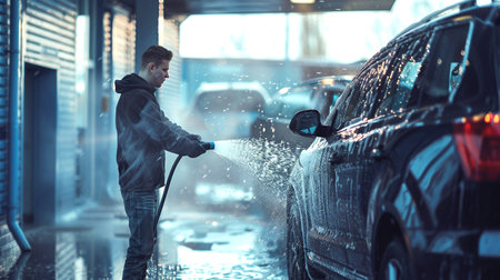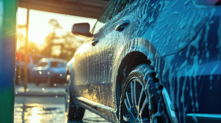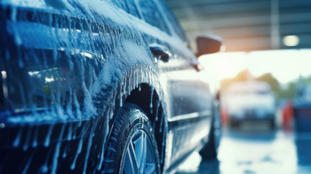 Generative AI, car wash with foam soap, high pressure vehicle washer machine sprays foam, self service