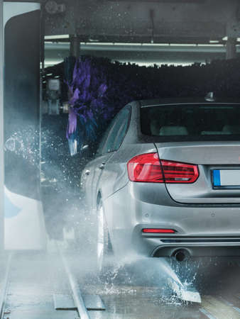 A grey business sedan vehicle running through an automatic car wash with brushes and water hitting car.