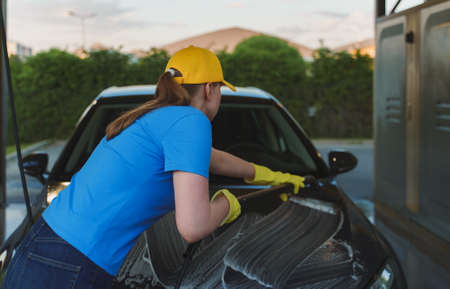 Woman in uniform cleaning car with brush. Car wash service.