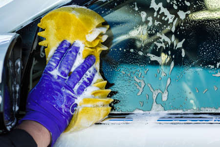 Close up view of man hands washing automobile.