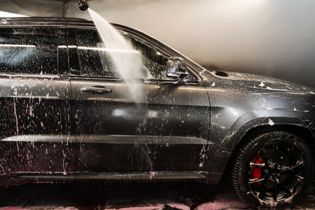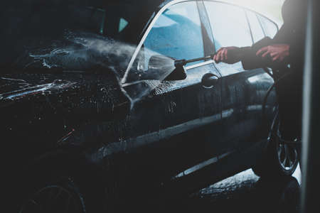 Process of removing dirt from car exterior surface with high pressure washer at self-serve cleaning station outdoors, rinsing off chemicals and white soap suds from vehicle at carwash center