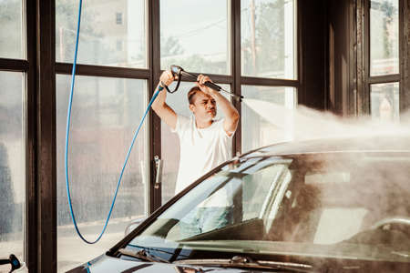 A young man at a car wash washes the car under high pressure. Selective focus.