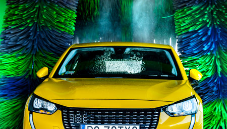 Vintage yellow car undergoing a thorough clean in an automatic foam car wash station