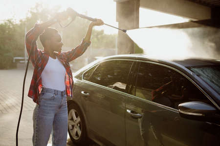 Woman holds high pressure water gun, car wash