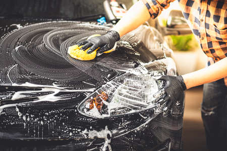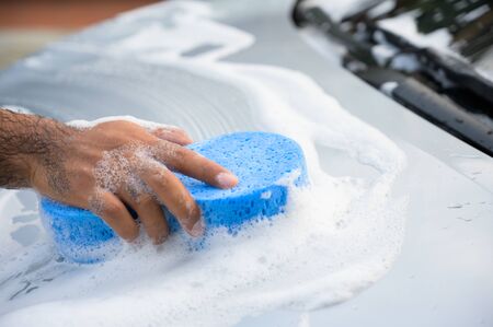 Man cleaning washing car with sponge and foam
