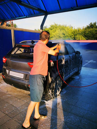 Ivano-Frankivsk, Ukraine August 14, 2020: car wash at a self-service car wash, a man washes his car. 2020