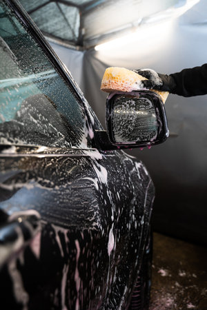 Cleaning the vehicle side mirror using sponge and pink foam detergent during a manual vehicle washing at a self-service car wash