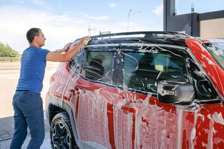 A man washes a red car with soap. Car in foam, car wash
