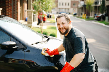 American Man washing own black car outside with sponge and wearing red gloves smiling at camera