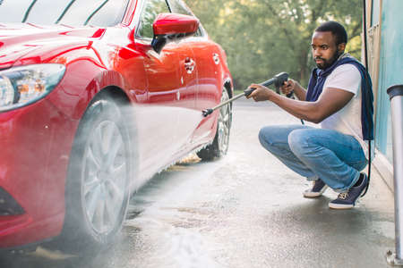 Car wheel, rim or alloy, wash outdoors. Car cleaning with water jet. Horizontal shot of pleasant African guy in white t-shirt and jeans, washing his red car wheel with high pressure water jet.