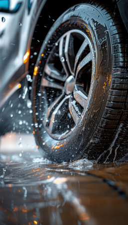 Self Car Washing. Cleaning Wheels Using High Pressure Water