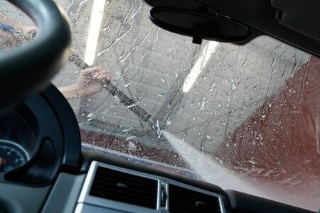 Car wash, clean foam service. Wax vehicle. Hand carwash with water and soap. Auto cleaner station.