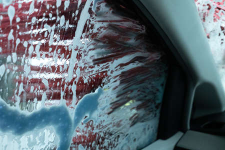 Car washing at car wash station with foam, car left mirror cleaning detail view from inside car