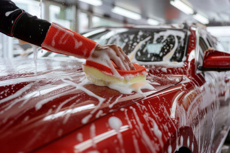 Worker washing red car with sponge on a car wash, close up. AI generative