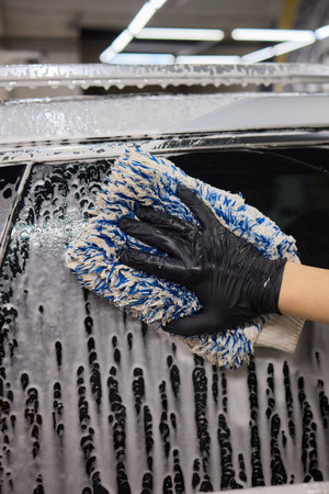 Person using blue glove for closeup car wash with brush and water