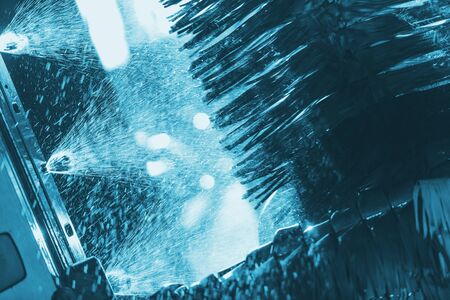 Automotive Industry. Running Automatic Brush Car Wash Cool Blue Color Grading Concept. Vehicle Maintenance. Pressure Washing with Brushes.