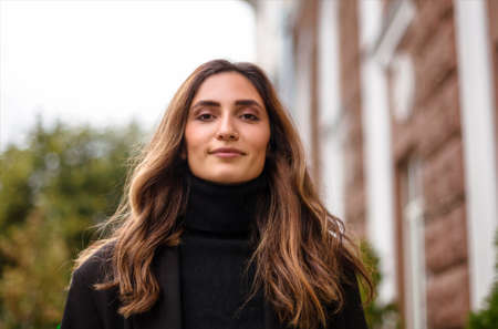 Portrait of a girl. A woman with long hair walks down the street. Beautiful brunette.