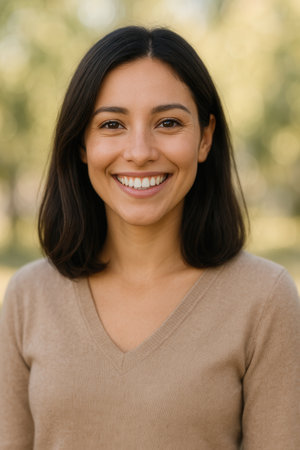 Cheerful Woman Portraits Smiling with Gentle Eyes Against Foliage Backdrop, Radiant and Happy Face