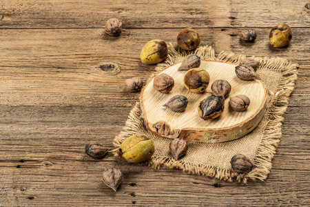 Ripe Juglans cordiformis Maxim or heart-shaped walnut. Young green and unpeeled whole nuts on a stand. Vintage wooden boards background, copy space