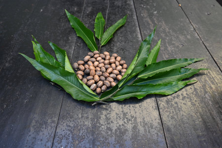 Polyalthia longifolia seeds. The Ashoka tree is native to India. A lofty evergreen tree. Leaves of Saraca asoca. Its other names False Ashoka. Green leaves and seeds.