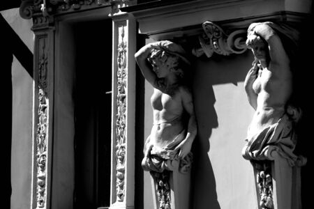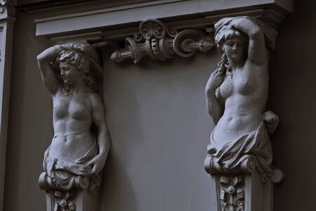 Portrait of balcony support statue of young and naked sensual Roman renaissance era women in Vienna, Austria