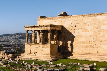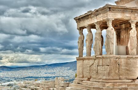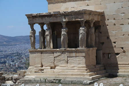 Erechtheion Caryatids porch with Athens city view, Acropolis, Greece.