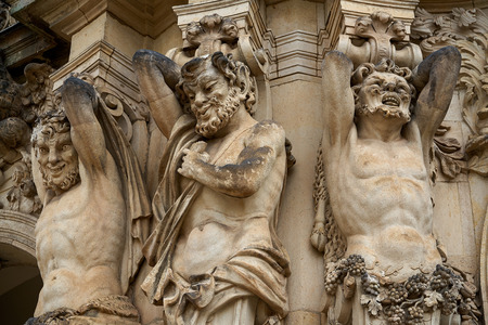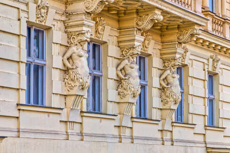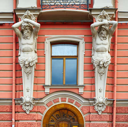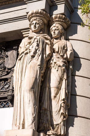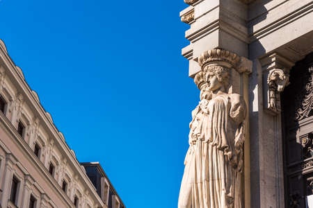 Architectural detail of the facade in neo-Baroque style with figures of Atlantes